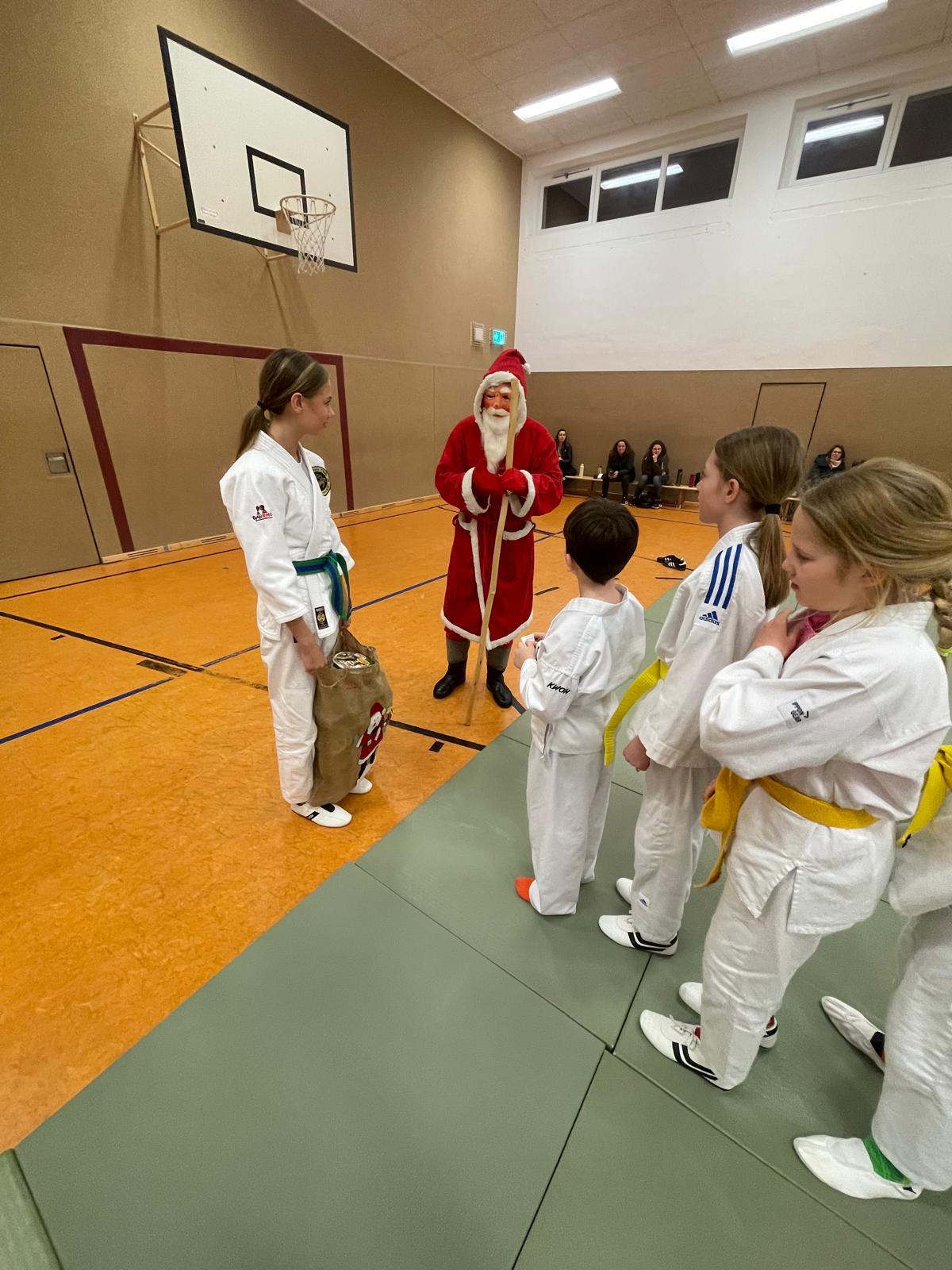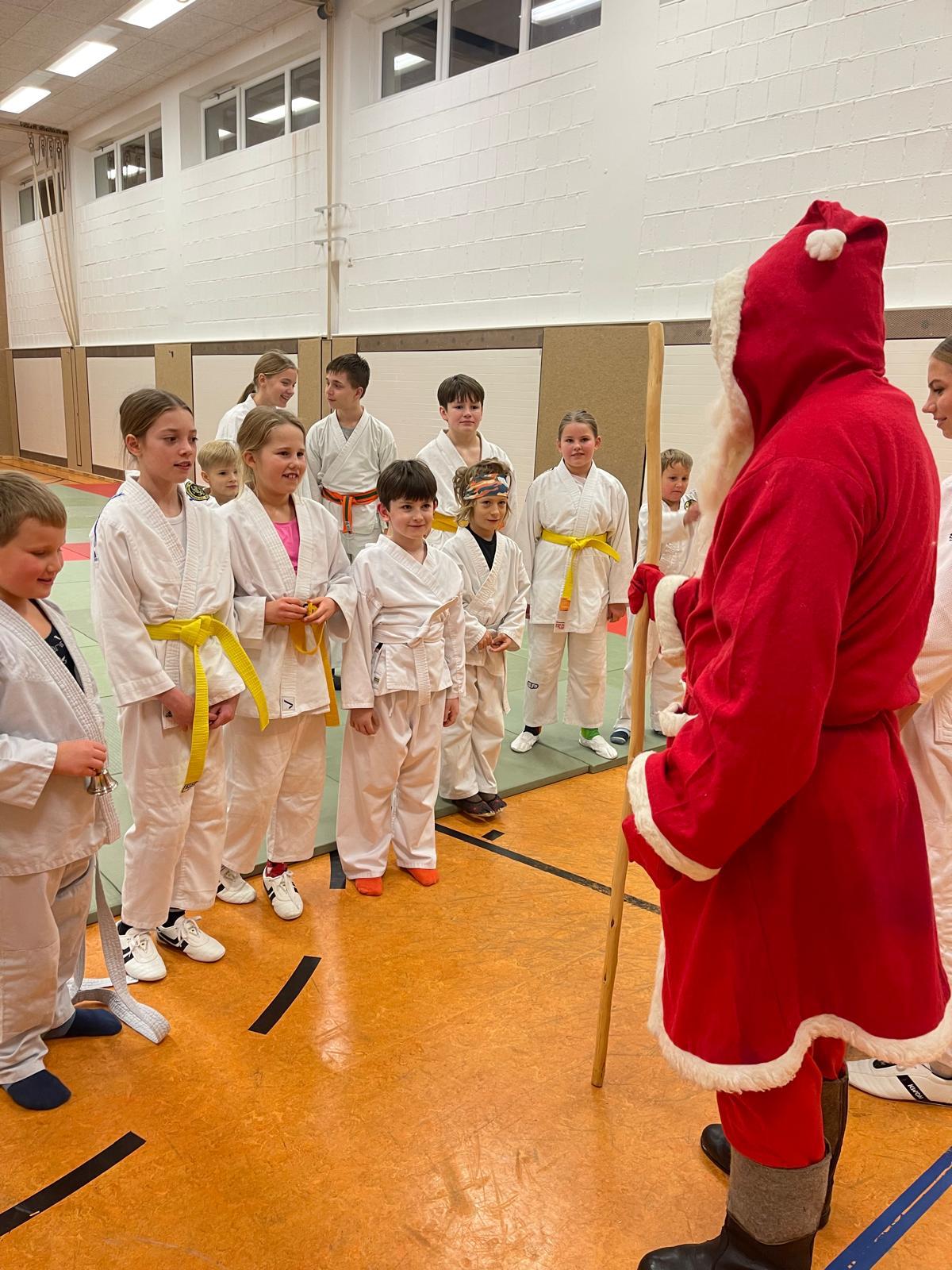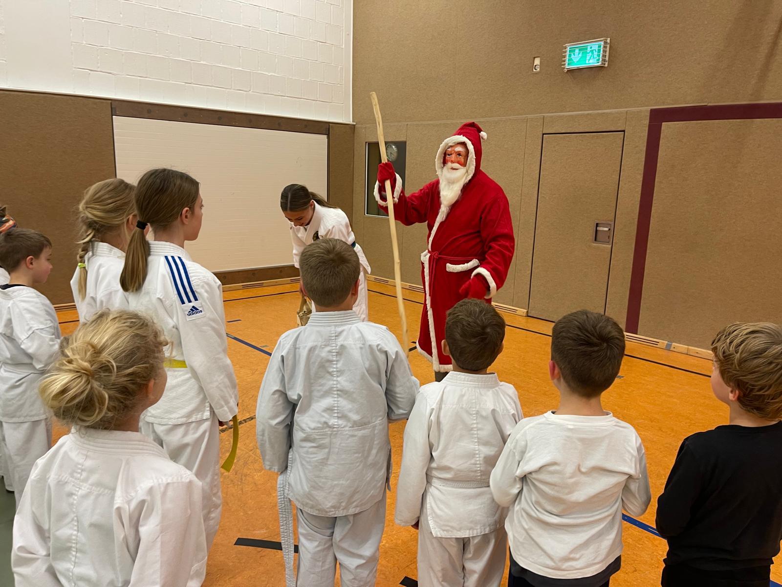 Scheinbar hatte sich der Nikolaus bei seinem Besuch im letzten Jahr gut gemerkt, wen er da vor sich hatte. Denn als er dieses Jahr kurz vor dem Ende des Kindertrainings hereinschneite, hatte er nicht eine gewöhnliche Rute, sondern einen echten Selbstverteidigungsstock dabei. Aber auch den musste er nicht einsetzen, denn fast all seine Wünsche wurden von unseren jungen Mitgliedern erfüllt.