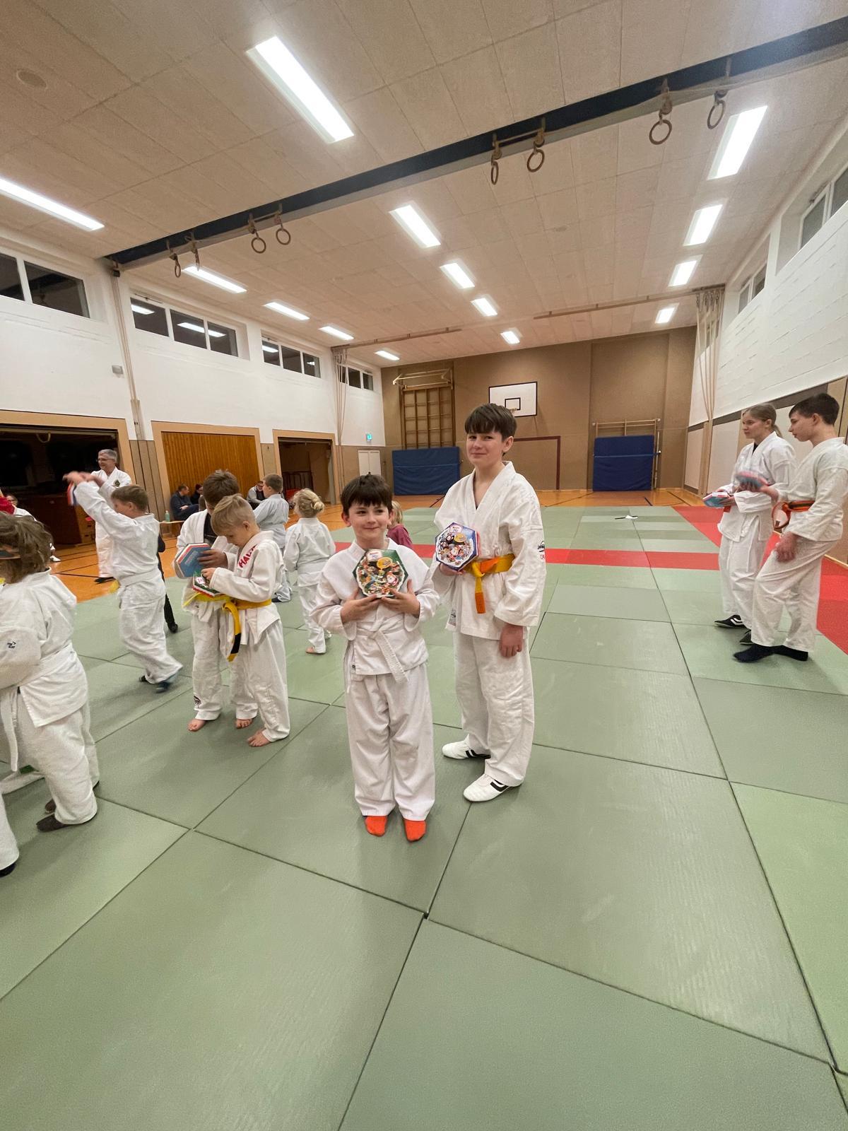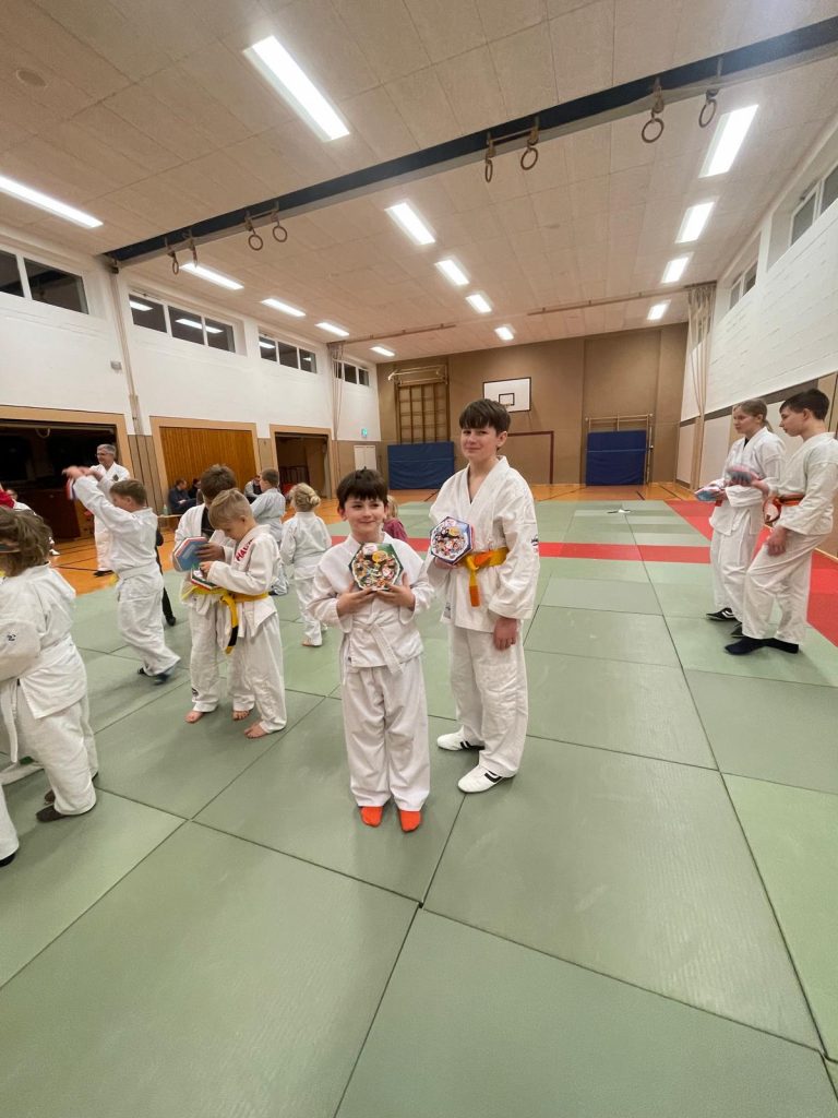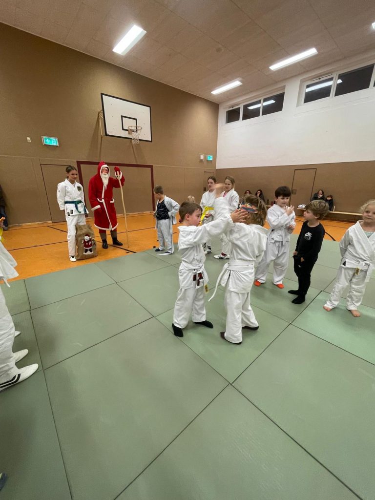 Scheinbar hatte sich der Nikolaus bei seinem Besuch im letzten Jahr gut gemerkt, wen er da vor sich hatte. Denn als er dieses Jahr kurz vor dem Ende des Kindertrainings hereinschneite, hatte er nicht eine gewöhnliche Rute, sondern einen echten Selbstverteidigungsstock dabei. Aber auch den musste er nicht einsetzen, denn fast all seine Wünsche wurden von unseren jungen Mitgliedern erfüllt.