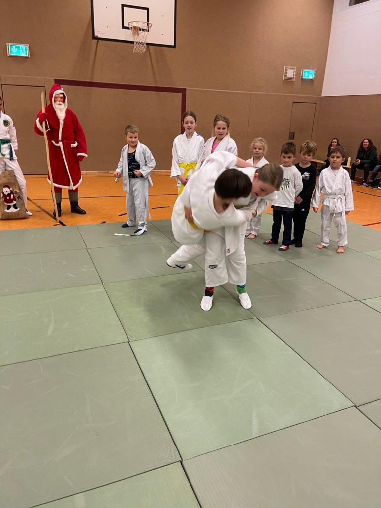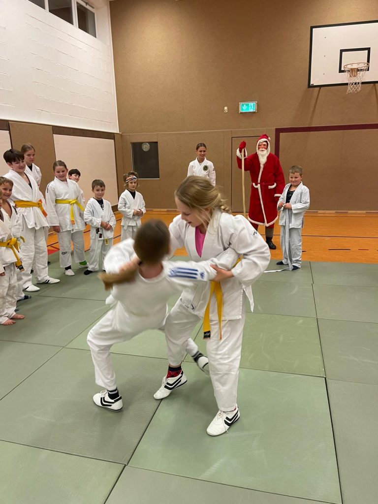 So wollte der Nikolaus beispielsweise sehen, was unsere Kinder und Jugendlichen alles im letzten Jahr gelernt haben. Das ließen sich diese nicht zwei Mal sagen, woraufhin ein professionelles Schlagen, Treten und Werfen begann. Dadurch geriet der Nikolaus ein wenig ins Schwitzen, und es war deutlich zu sehen, dass er seinen Selbstverteidigungsstock etwas fester umklammerte.